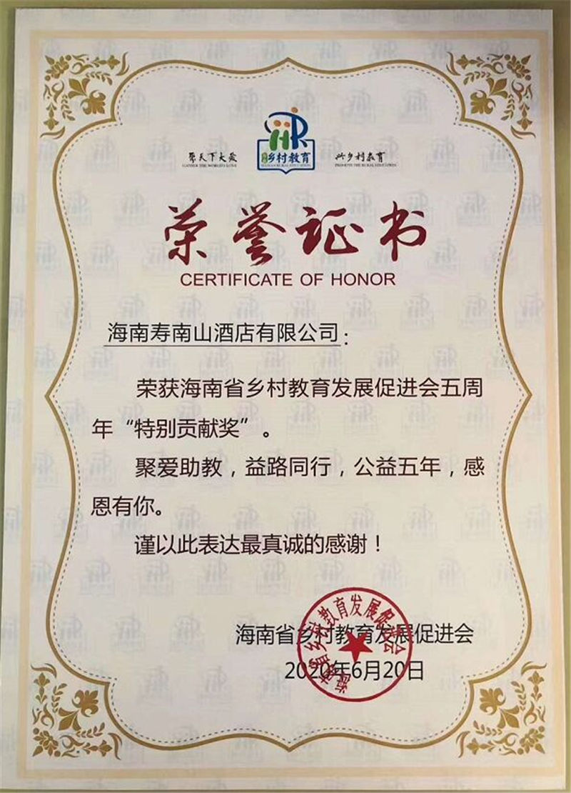 熱烈祝賀海南壽南山集團(tuán)旗下的海南壽南山酒店有限公司再次榮獲由海南省鄉(xiāng)村教育發(fā)展促進(jìn)會(huì)頒發(fā)的2020年海南省鄉(xiāng)村教育發(fā)展促進(jìn)五周年“特別貢獻(xiàn)獎(jiǎng)”。