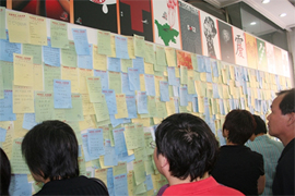 上海站展覽還特別設(shè)置了捐獻(xiàn)鮮花和留言墻這兩個(gè)特色項(xiàng)目。圖片、實(shí)物,配合著解說員動(dòng)情的解說,感染著在場(chǎng)的每一位觀眾。