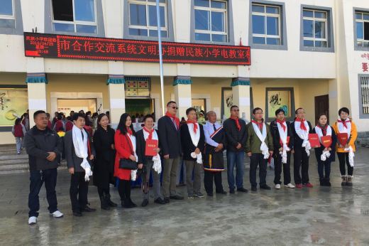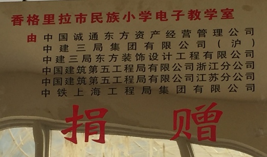 2015年4月25日上午,在云南迪慶州香格里拉民族小學(xué)操場(chǎng),舉行了隆重的升旗儀式和捐贈(zèng)儀式。上海市政府合作交流系統(tǒng)文明辦主任王靖、中國(guó)誠(chéng)通東方資產(chǎn)經(jīng)營(yíng)管理公司黨辦副主任周宇皛、中鐵上海工程局集團(tuán)及中國(guó)建筑等6家駐滬央企代表向香格里拉民族小學(xué)捐贈(zèng)電教室,并向師生贈(zèng)送了保暖用品。云南省迪慶藏族自治州州長(zhǎng)助理、上海市援滇干部周勝春、香格里拉市副市長(zhǎng)和雨、校長(zhǎng)松建華為公司代表頒發(fā)了榮譽(yù)證書。