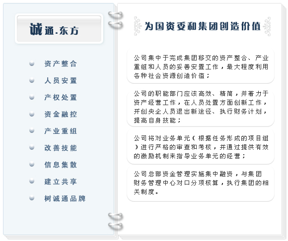 中國(guó)誠(chéng)通東方資產(chǎn)經(jīng)營(yíng)管理有限公司系國(guó)務(wù)院國(guó)資委監(jiān)管的中國(guó)誠(chéng)通控股集團(tuán)有限公司的二級(jí)全資子企業(yè),主營(yíng)國(guó)有資產(chǎn)經(jīng)營(yíng)管理。公司是在整合原國(guó)家物資部四大地區(qū)公司資源基礎(chǔ)上而轉(zhuǎn)型的,總部機(jī)構(gòu)設(shè)立在上海,至今已有70年歷史。誠(chéng)通東方是上海市和全國(guó)文明單位。 |